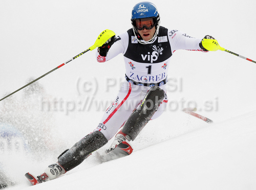 : Benjamin Raich of Austria skiing in first run of Men slalom race of Audi FIS alpine skiing World Cup in Zagreb, Croatia. Slalom race of Men Audi FIS Alpine skiing World Cup 2010-11, was held on Thursday, 6th of January 2011, in Sljeme above Zagreb, Croatia.