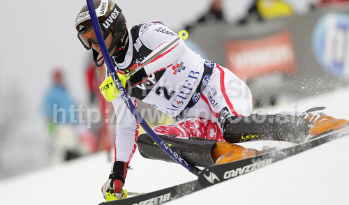 : Reinfried Herbst of Austria skiing in first run of Men slalom race of Audi FIS alpine skiing World Cup in Zagreb, Croatia. Slalom race of Men Audi FIS Alpine skiing World Cup 2010-11, was held on Thursday, 6th of January 2011, in Sljeme above Zagreb, Croatia.
