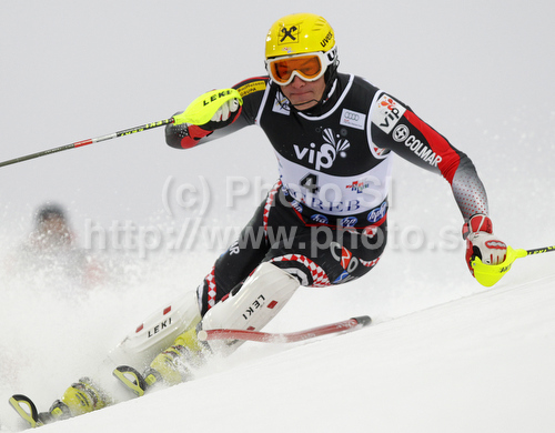 : Ivica Kostelic of Croatia skiing in first run of Men slalom race of Audi FIS alpine skiing World Cup in Zagreb, Croatia. Slalom race of Men Audi FIS Alpine skiing World Cup 2010-11, was held on Thursday, 6th of January 2011, in Sljeme above Zagreb, Croatia.