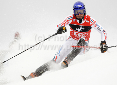 : Jean-Baptiste Grange of France skiing in first run of Men slalom race of Audi FIS alpine skiing World Cup in Zagreb, Croatia. Slalom race of Men Audi FIS Alpine skiing World Cup 2010-11, was held on Thursday, 6th of January 2011, in Sljeme above Zagreb, Croatia.