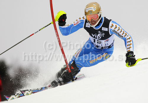 : Andre Myhrer of Sweden skiing in first run of Men slalom race of Audi FIS alpine skiing World Cup in Zagreb, Croatia. Slalom race of Men Audi FIS Alpine skiing World Cup 2010-11, was held on Thursday, 6th of January 2011, in Sljeme above Zagreb, Croatia.