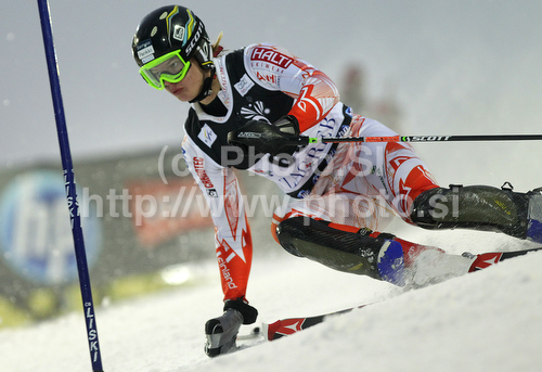 : Victor Malmstrom of Finland skiing in first run of Men slalom race of Audi FIS alpine skiing World Cup in Zagreb, Croatia. Slalom race of Men Audi FIS Alpine skiing World Cup 2010-11, was held on Thursday, 6th of January 2011, in Sljeme above Zagreb, Croatia.