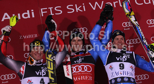 Zagreb ,Croatia - 06.01.2011 : Winner Andre Myhrer of Sweden (M), second placed Ivica Kostelic of Croatia (L) and third placed Mattias Hargin of Sweden (R) celebrate their medals won in Men slalom race of Audi FIS alpine skiing World Cup in Zagreb, Croatia. Slalom race of Men Audi FIS Alpine skiing World Cup 2010-11, was held on Thursday, 6th of January 2011, in Sljeme above Zagreb, Croatia. Photo by: Primoz Jeroncic