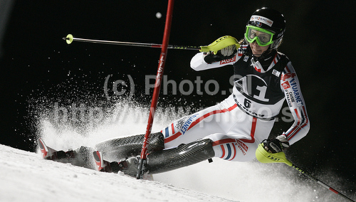 : Sandrine Aubert of France skiing in first run of Women night slalom race of Audi FIS alpine skiing World Cup in Flachau, Austria. Slalom race of Women Audi FIS Alpine skiing World Cup 2010-11, was held on Tuesday, 11th of January 2011, in Flachau, Austria.