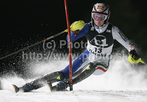 : Manuela Moelgg of Italy skiing in first run of Women night slalom race of Audi FIS alpine skiing World Cup in Flachau, Austria. Slalom race of Women Audi FIS Alpine skiing World Cup 2010-11, was held on Tuesday, 11th of January 2011, in Flachau, Austria.