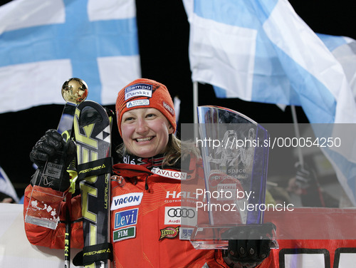 : Winner Tanja Poutiainen of Finland celebrates her medal won in Women night slalom race of Audi FIS alpine skiing World Cup in Flachau, Austria. Slalom race of Women Audi FIS Alpine skiing World Cup 2010-11, was held on Tuesday, 11th of January 2011, in Flachau, Austria.
