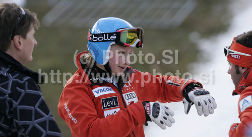 : Tanja Poutiainen of Finland (M) with her serviceman Jan Tuupainen (L) and her coach Luca Moretti (R) during inspection of first run of Women giant slalom race of Audi FIS alpine skiing World Cup in Maribor, Slovenia. Giant slalom race of Women Audi FIS Alpine skiing World Cup 2010-11, was held on Saturday, 15th of January 2011, in Maribor, Slovenia.