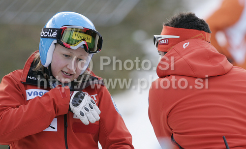 : Tanja Poutiainen of Finland (L) with her coach Luca Moretti (R) during inspection of first run of Women giant slalom race of Audi FIS alpine skiing World Cup in Maribor, Slovenia. Giant slalom race of Women Audi FIS Alpine skiing World Cup 2010-11, was held on Saturday, 15th of January 2011, in Maribor, Slovenia.