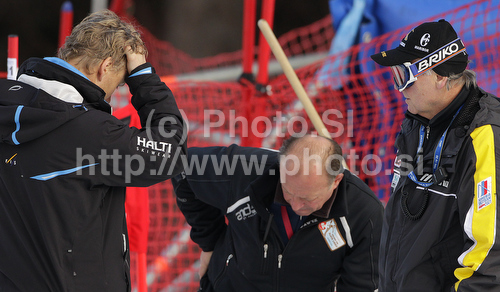 : FIS official Atle Skardal (L) in discussion with chief of competition Gorazd Bedrac (R) before race got canceled during first run of Women giant slalom race of Audi FIS alpine skiing World Cup in Maribor, Slovenia. Giant slalom race of Women Audi FIS Alpine skiing World Cup 2010-11, was held on Saturday, 15th of January 2011, in Maribor, Slovenia.