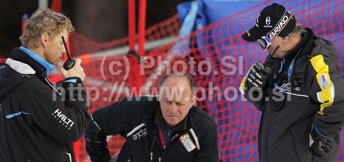 : FIS official Atle Skardal (L) in discussion with chief of competition Gorazd Bedrac (R) before race got canceled during first run of Women giant slalom race of Audi FIS alpine skiing World Cup in Maribor, Slovenia. Giant slalom race of Women Audi FIS Alpine skiing World Cup 2010-11, was held on Saturday, 15th of January 2011, in Maribor, Slovenia.