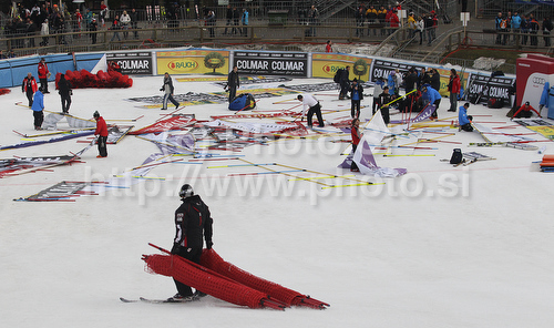: Course workers are clearing course after Women slalom race of Audi FIS alpine skiing World Cup in Maribor, Slovenia got canceled. Slalom race of Women Audi FIS Alpine skiing World Cup 2010-11, was planned to be held on Sunday, 16th of January 2011, in Maribor, Slovenia.