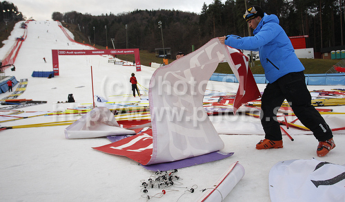 : Course workers are clearing course after Women slalom race of Audi FIS alpine skiing World Cup in Maribor, Slovenia got canceled. Slalom race of Women Audi FIS Alpine skiing World Cup 2010-11, was planned to be held on Sunday, 16th of January 2011, in Maribor, Slovenia.