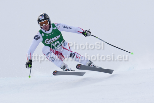 : Hannes Reichelt (AUT) takes to the air competing in the 2011 Hahnenkamm Super Giant Slalom race (Super G)part of Audi FIS World Cup races in Kitzbuhel Austria.