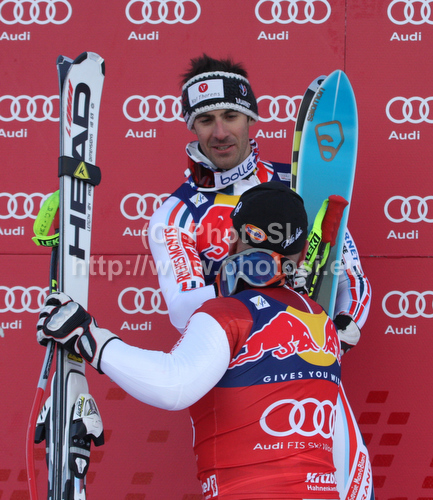 : Didier Cuche (SUI) winner congratulates Adrien Theaux (FRA) 2nd at the presentation ceremony for the 71st Hahnenkamm downhill race part of Audi FIS World Cup races in Kitzbuhel Austria.