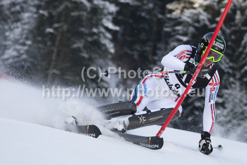 : Steve Missillier (FRA) attacks a control gate while competing in the slalom race part of Audi FIS World Cup races in Kitzbuhel Austria.