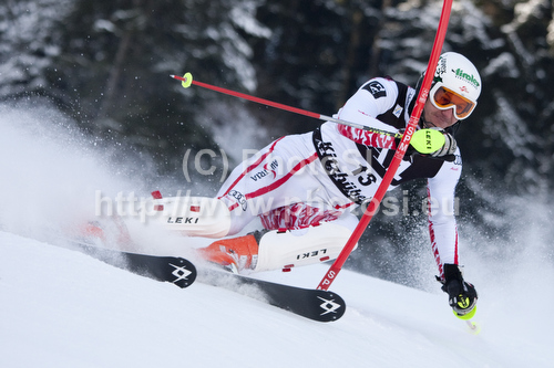 : Manfred Pranger (AUT) attacks a control gate while competing in the slalom race part of Audi FIS World Cup races in Kitzbuhel Austria.