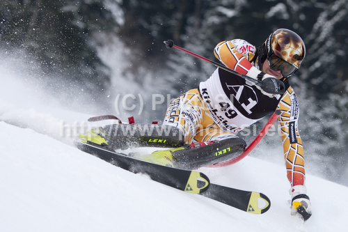 Kitzbuhel ,Austria - 23.01.2011 : Trevor White (CAN) attacks a control gate while competing in the slalom race part of Audi FIS World Cup races in Kitzbuhel Austria. Photo by: Mitchell Gunn / PhotoSI