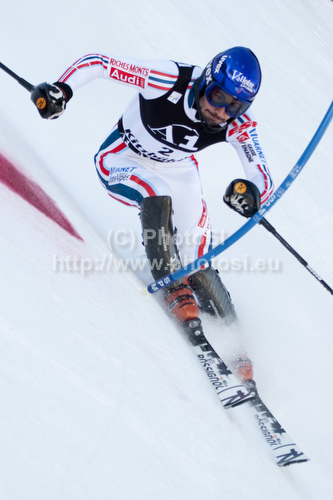 : Jean-Baptiste Grange (FRA) attacks a control gate while competing in the slalom race part of Audi FIS World Cup races in Kitzbuhel Austria.