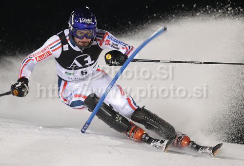 : Jean-Baptiste Grange of France skiing in first run of Men slalom race of Audi FIS alpine skiing World Cup in Schladming, Austria. Traditional Night slalom race of Men Audi FIS Alpine skiing World Cup 2010-11, was held on Tuesday, 25th of January 2011, in Schladming, Austria.