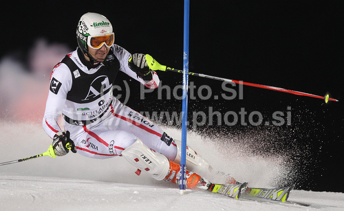 : Manfred Pranger of Austria skiing in first run of Men slalom race of Audi FIS alpine skiing World Cup in Schladming, Austria. Traditional Night slalom race of Men Audi FIS Alpine skiing World Cup 2010-11, was held on Tuesday, 25th of January 2011, in Schladming, Austria.