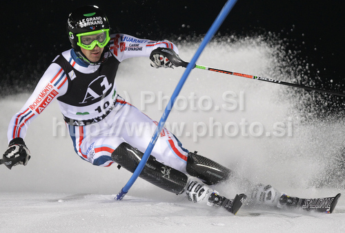 : Steve Missillier of France skiing in first run of Men slalom race of Audi FIS alpine skiing World Cup in Schladming, Austria. Traditional Night slalom race of Men Audi FIS Alpine skiing World Cup 2010-11, was held on Tuesday, 25th of January 2011, in Schladming, Austria.