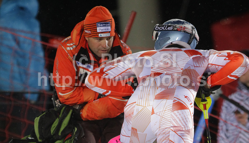 : Kalle Palander of Finland (R) in discussion with his coach, Janez Slivnik (L) after falling in first run of Men slalom race of Audi FIS alpine skiing World Cup in Schladming, Austria. Traditional Night slalom race of Men Audi FIS Alpine skiing World Cup 2010-11, was held on Tuesday, 25th of January 2011, in Schladming, Austria.