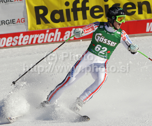 : Alexis Pinturault of France reacts in finish of Men Super-G race of Audi FIS alpine skiing World Cup in Hinterstoder, Austria. Super-G race of Men Audi FIS Alpine skiing World Cup 2010-11, was held on Saturday, 5th of February 2011, in Hinterstoder, Austria.