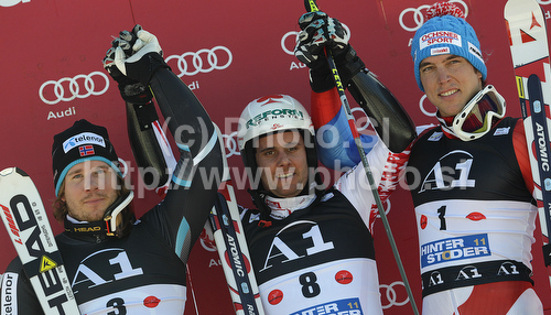 Hinterstoder ,Austria - 06.02.2011 : Winner Philipp Schoerghofer of Austria (M), second placed Kjetil Jansrud of Norway (L) and third placed Carlo Janka of Switzerland (R) celebrate their medals won in Men Giant slalom race of Audi FIS alpine skiing World Cup in Hinterstoder, Austria. Giant slalom race of Men Audi FIS Alpine skiing World Cup 2010-11, was held on Sunday, 6th of February 2011, in Hinterstoder, Austria. Photo by: Primoz Jeroncic