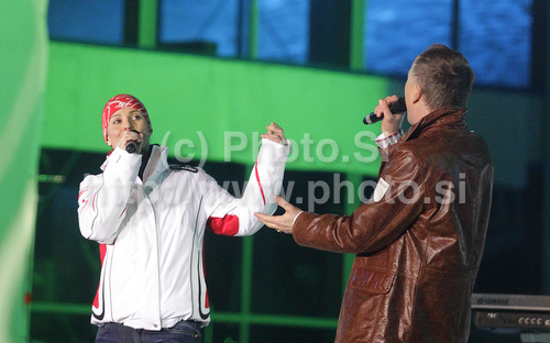 Garmisch-Partenkirchen ,Germany - 07.02.2011 : Elisabeth Goergl of Austria (L) singing official song of FIS Alpine skiing World championships during opening ceremony of FIS Alpine skiing World championships in Garmisch-Partenkirchen. Opening ceremony of FIS Alpine skiing World championships in Garmisch-Partenkirchen, Germany, was held on evening of Monday, 7th of February 2011 in Olympia stadium in Garmisch-Partenkirchen. Photo by: Primoz Jeroncic