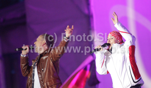 : Elisabeth Goergl of Austria (R) singing official song of FIS Alpine skiing World championships during opening ceremony of FIS Alpine skiing World championships in Garmisch-Partenkirchen. Opening ceremony of FIS Alpine skiing World championships in Garmisch-Partenkirchen, Germany, was held on evening of Monday, 7th of February 2011 in Olympia stadium in Garmisch-Partenkirchen.