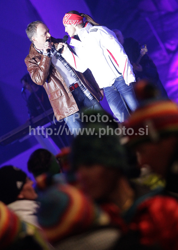 : Elisabeth Goergl of Austria (R) singing official song of FIS Alpine skiing World championships during opening ceremony of FIS Alpine skiing World championships in Garmisch-Partenkirchen. Opening ceremony of FIS Alpine skiing World championships in Garmisch-Partenkirchen, Germany, was held on evening of Monday, 7th of February 2011 in Olympia stadium in Garmisch-Partenkirchen.