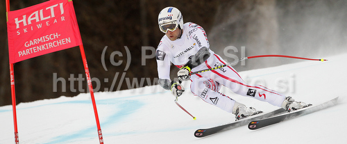 : Sixth placed Romed Baumann of Austria skiing in Men Super-G race of FIS alpine skiing World Championships in Garmisch-Partenkirchen, Germany. Super-G race of Men Super-G race of FIS alpine skiing World Championships, was held on Wednesday, 9th of February 2011, in Garmisch-Partenkirchen, Germany.