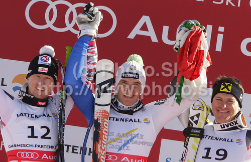 Garmisch-Partenkirchen ,Germany - 09.02.2011 : Winner Christof Innerhofer of Italy (M), second placed Hannes Reichelt of Austria (L) and third placed Ivica Kostelic of Croatia (R) celebrate their medals won in Men Super-G race of FIS alpine skiing World Championships in Garmisch-Partenkirchen, Germany. Super-G race of Men Super-G race of FIS alpine skiing World Championships, was held on Wednesday, 9th of February 2011, in Garmisch-Partenkirchen, Germany. Photo by: Mitja Smid Bricelj