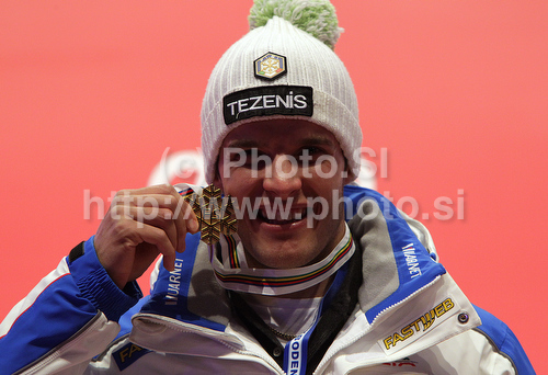 : Winner Christof Innerhofer of Italy celebrates his medal won in Women Super-G race of FIS alpine skiing World Championships in Garmisch-Partenkirchen, Germany. Super-G race of Women Super-G race of FIS alpine skiing World Championships, was held on Tuesday, 8th of February 2011, in Garmisch-Partenkirchen, Germany.