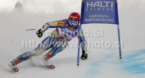 : Rok Perko of Slovenia skiing in training run for Men downhill race of FIS alpine skiing World Championships in Garmisch-Partenkirchen, Germany. Training run for men downhill race of Men Super-G race of FIS alpine skiing World Championships, was held on Thursday, 10th of February 2011, in Garmisch-Partenkirchen, Germany.