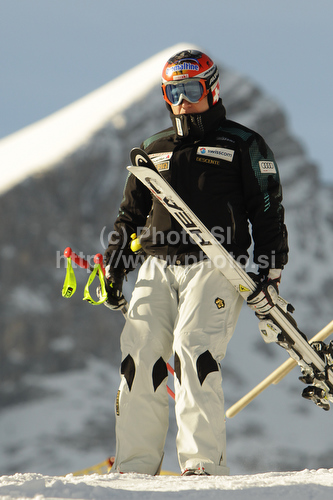 : Didier Cuche of Switzerland before the start of training of Mens Downhill race of FIS alpine skiing World Championships in Garmisch-Partenkirchen, Germany. Training of Mens Downhill race of FIS alpine skiing World Championships, was held on Thursday, 10th of February 2011, in Garmisch-Partenkirchen, Germany.