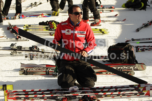 : Serviceman preparing skis before the start of training of Mens Downhill race of FIS alpine skiing World Championships in Garmisch-Partenkirchen, Germany. Training of Mens Downhill race of FIS alpine skiing World Championships, was held on Thursday, 10th of February 2011, in Garmisch-Partenkirchen, Germany.