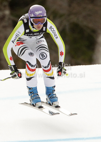 : Maria Riesch of Germany skiing in downhill part of Women super combined race of FIS alpine skiing World Championships in Garmisch-Partenkirchen, Germany. Super combined race of Women FIS alpine skiing World Championships, was held on Friday, 11th of February 2011, in Garmisch-Partenkirchen, Germany.