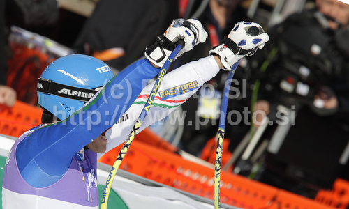 : Christof Innerhofer of Italy reacts in the finish of Mens Downhill race of FIS alpine skiing World Championships in Garmisch-Partenkirchen, Germany. Mens Downhill race of FIS alpine skiing World Championships, was held on Saturday, 12th of February 2011, in Garmisch-Partenkirchen, Germany.