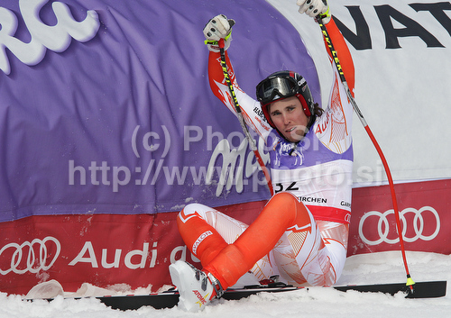 : Andreas Romar of Finland reacts in the finish of Mens Downhill race of FIS alpine skiing World Championships in Garmisch-Partenkirchen, Germany. Mens Downhill race of FIS alpine skiing World Championships, was held on Saturday, 12th of February 2011, in Garmisch-Partenkirchen, Germany.