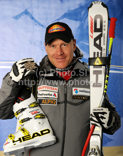 : Second placed Didier Cuche of Switzerland celebrates his medal won in Men downhill race of FIS alpine skiing World Championships in Garmisch-Partenkirchen, Germany. Men downhill race of FIS alpine skiing World Championships, was held on Saturday, 12th of February 2011, in Garmisch-Partenkirchen, Germany.