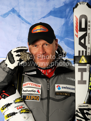 Garmisch-Partenkirchen ,Germany - 12.02.2011 : Second placed Didier Cuche of Switzerland celebrates his medal won in Men downhill race of FIS alpine skiing World Championships in Garmisch-Partenkirchen, Germany. Men downhill race of FIS alpine skiing World Championships, was held on Saturday, 12th of February 2011, in Garmisch-Partenkirchen, Germany. Photo by: Pool/PhotoSI