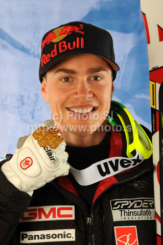 Garmisch-Partenkirchen ,Germany - 12.02.2011 : Winner Erik Guay of Canada celebrates his medal won in Men downhill race of FIS alpine skiing World Championships in Garmisch-Partenkirchen, Germany. Men downhill race of FIS alpine skiing World Championships, was held on Saturday, 12th of February 2011, in Garmisch-Partenkirchen, Germany. Photo by: Pool/PhotoSI