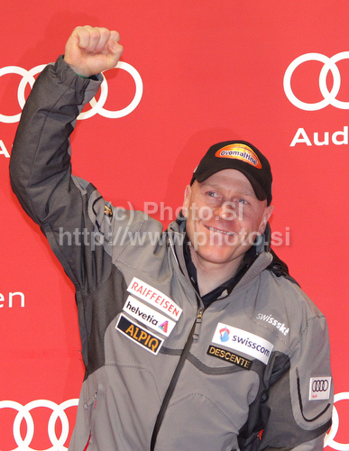 : Second placed Didier Cuche of Switzerland celebrates his medal won in Men downhill race of FIS alpine skiing World Championships in Garmisch-Partenkirchen, Germany. Men downhill race of FIS alpine skiing World Championships, was held on Saturday, 12th of February 2011, in Garmisch-Partenkirchen, Germany.