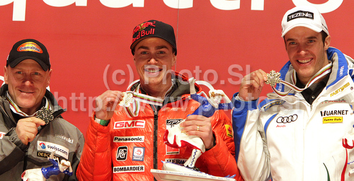 Garmisch-Partenkirchen ,Germany - 12.02.2011 : Winner Erik Guay of Canada (M), second placed Didier Cuche of Switzerland (L) and third placed Christof Innerhofer of Italy (R) celebrate their medals won in Men downhill race of FIS alpine skiing World Championships in Garmisch-Partenkirchen, Germany. Men downhill race of FIS alpine skiing World Championships, was held on Saturday, 12th of February 2011, in Garmisch-Partenkirchen, Germany. Photo by: Mitja Smid Bricelj