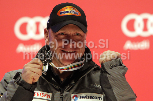 Garmisch-Partenkirchen ,Germany - 12.02.2011 : Second placed Didier Cuche of Switzerland celebrates his medal won in Men downhill race of FIS alpine skiing World Championships in Garmisch-Partenkirchen, Germany. Men downhill race of FIS alpine skiing World Championships, was held on Saturday, 12th of February 2011, in Garmisch-Partenkirchen, Germany. Photo by: Mitja Smid Bricelj