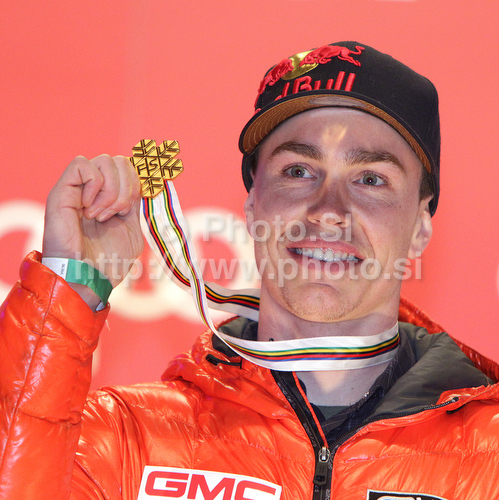 Garmisch-Partenkirchen ,Germany - 12.02.2011 : Winner Erik Guay of Canada celebrates his medal won in Men downhill race of FIS alpine skiing World Championships in Garmisch-Partenkirchen, Germany. Men downhill race of FIS alpine skiing World Championships, was held on Saturday, 12th of February 2011, in Garmisch-Partenkirchen, Germany. Photo by: Mitja Smid Bricelj