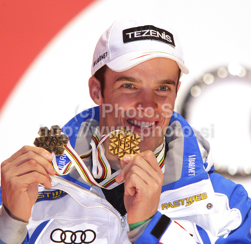 : Third placed Christof Innerhofer of Italy celebrates his medal won in Men downhill race of FIS alpine skiing World Championships in Garmisch-Partenkirchen, Germany. Men downhill race of FIS alpine skiing World Championships, was held on Saturday, 12th of February 2011, in Garmisch-Partenkirchen, Germany.