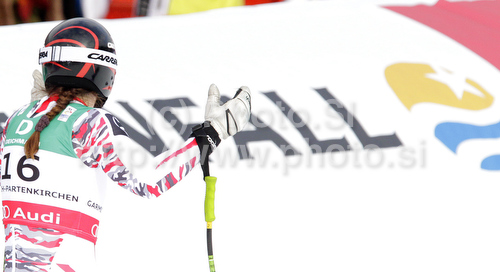 : Winner Elisabeth Goergl of Austria reacts in finish of women downhill race of FIS alpine skiing World Championships in Garmisch-Partenkirchen, Germany. Women downhill race of FIS alpine skiing World Championships, was held on Sunday, 13th of February 2011, in Garmisch-Partenkirchen, Germany.