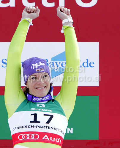 : Third placed Maria Riesch of Germany celebrates her medal won in women downhill race of FIS alpine skiing World Championships in Garmisch-Partenkirchen, Germany. Women downhill race of FIS alpine skiing World Championships, was held on Sunday, 13th of February 2011, in Garmisch-Partenkirchen, Germany.
